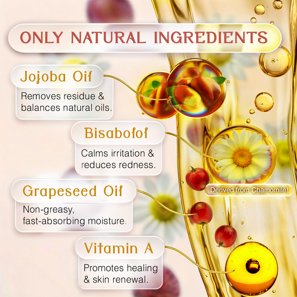Caprilic/Capric Triglyceride, Simmondsia Chinensis (Jojoba) Seed Oil, Vitis Vinifera (Grape) Seed Oil, Prunus Persica (Peach) Kernel Oil, Prunus Amygdalus Dulcis (Sweet Almond) Oil, Melaleuca Alternifolia (Tea Tree) Leaf Oil, Citrus Limon (Lemon) Peel Oil, Cymbopogon Schoenanthus (Lemongrass) Oil, Mentha Piperita (Peppermint) Oil, Phenoxyethanol, Retinyl Palmitate (Vitamin A Palmitate), Bisabolol (Natural Bisabolol).