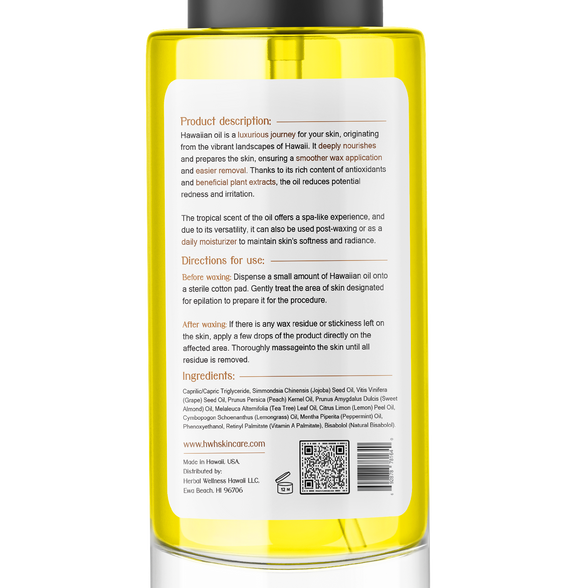 Hawaiian oil is more than just a pre-waxing treatment; it's a luxurious journey for your skin, originating from the vibrant landscapes of Hawaii. It deeply nourishes and prepares the skin, ensuring a smoother wax application and easier removal. Thanks to its rich content of antioxidants and beneficial plant extracts, the oil reduces potential redness and irritation. The tropical scent of the oil offers a spa-like experience, and due to its versatility, it can also be used post-waxing or as a daily moisturizer to maintain skin's softness and radiance.